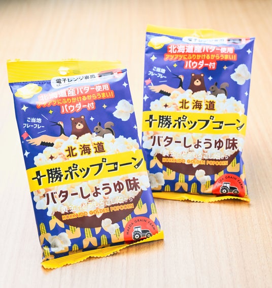 ポップコーンに使用する「爆裂種」といわれるトウモロコシは海外産が多い中、北海道「十勝ポップコーン」は、自社農場で栽培したトウモロコシを使用。生産から加工、販売まで自社で手掛けたオリジナル商品です。電子レンジで2分間加熱し、道産バターを使った「バターしょうゆパウダー」を振りかけるひと手間も楽しめます。オープン価格で1袋54g入り。道内の土産店や北海道のアンテナショップなどで販売しており、人気商品となっています。