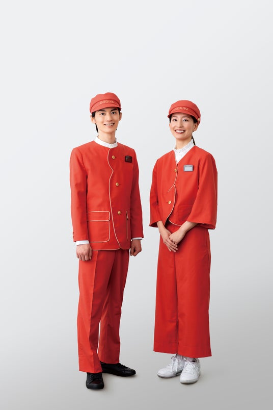 本プロジェクトは、「mina perhonen」の皆川 明氏をデザイナーに迎え、ブランドの価値観をあらためて可視化する取り組みとして実施しました。ユニフォームに採用された象徴的な赤は、ブランドの核にある情熱を表現、またデザイン面では、ゴディバのハート形のチョコレート(クール)からインスピレーションを受けた襟のパイピング、四つ葉のクローバーボタンなど、ゴディバのブランドの歴史と哲学を細部に織り込みました。四つの葉は、関わるすべての人々への想いを象徴しています。加えて、店舗スタッフへのヒアリングを重ね、動きやすい設計や快適性を追求、美しさと機能性の両立を図り、店舗体験を支える装いへと刷新しました。