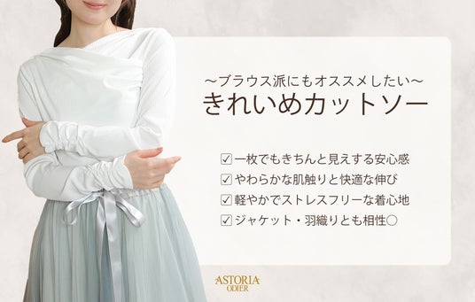 通勤・お出かけにぴったりな、上品でフェミニンなアイテムを提案する株式会社アストリア(本社:東京都文京区、代表取締役:安藤康成)は、働く女性に向けた新提案として、「きれいめカットソー」シリーズを発表いたします。