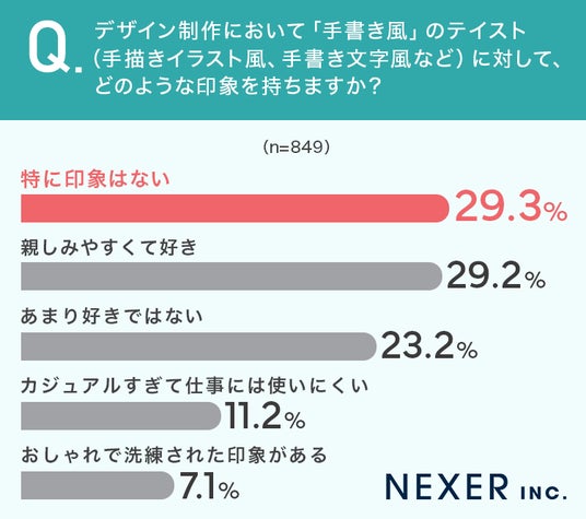 ■「手書き風」テイストは「特に印象はない」が29.3%で最多、「親しみやすくて好き」が29.2%で僅差に