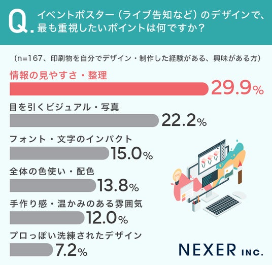 同じく、印刷物の制作経験がある方・興味がある方に、イベントポスターをデザインする際に最も重視したいポイントを聞いてみました。
