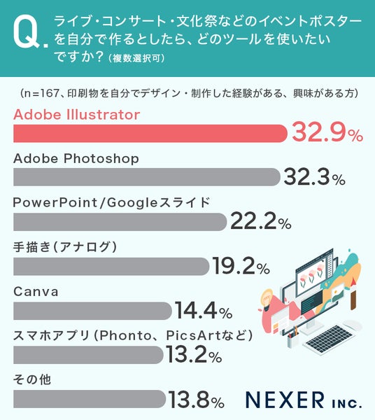 続いて、印刷物の制作経験がある方・興味がある方に、ライブ・コンサート・文化祭などのイベントポスターを自分で作るとしたらどのツールを使いたいかを聞いてみました。
