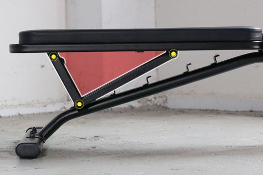 高重量時のシートのしなりを大幅に軽減する3点支持フレーム構造。その耐荷重は300kg(検査済み)。身体を支え、負荷を逃さずに本格的なトレーニングが可能です。