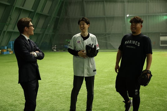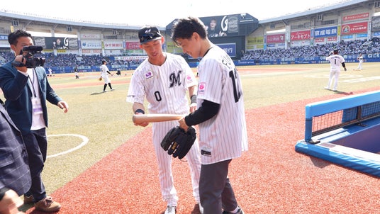 セレモニアルピッチ直前、グラウンドには、アップ後の佐藤都志也選手、高部瑛斗選手をはじめ、千葉ロッテマリーンズの選手・コーチたちが次々と激励に訪れました。