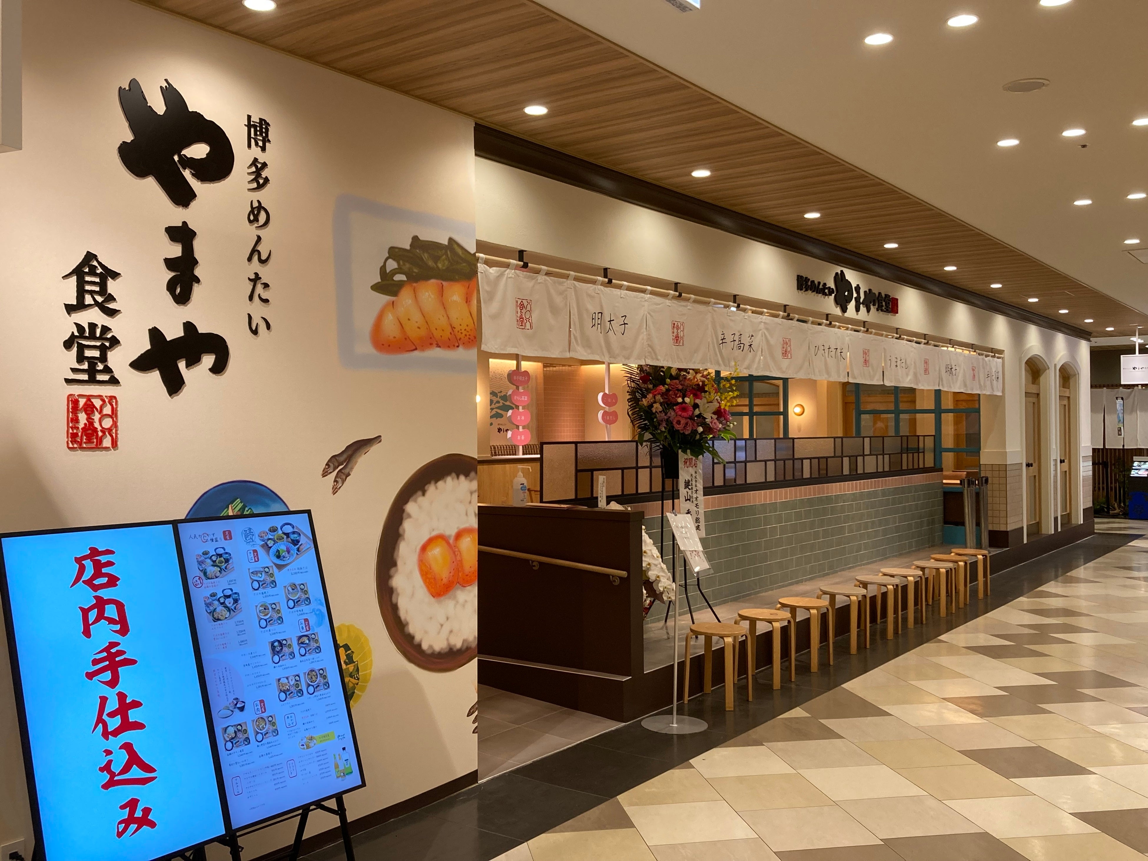 2025年6月オープン。3階「博多めんたいやまや食堂」では、九州の味覚を定食で楽しめ、炊きたてご飯、明太子、からし高菜が