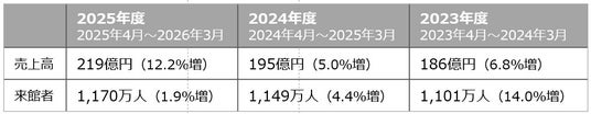 2025年度の売上高は約219億円、来館者数は約1,170万人となりました。特に売上高は、12ヶ月を通じてすべての月で前年度を上回り、12月・1月を除いて各月の売上高はいずれも過去最高を記録いたしました(※1)。