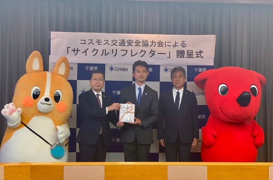 本年も、千葉県環境生活部くらし安全推進課を通じてこれを実施することとなり、2026年4月8日(水)、梅田会長、中元 広之 副会長(千葉日報社 代表取締役社長)から熊谷 俊人 千葉県知事へサイクルリフレクター30,000個を贈呈いたしました。コスモス交通安全協力会では、今回を含め32年間で、累計556,400個のサイクルリフレクターを贈呈しております。
