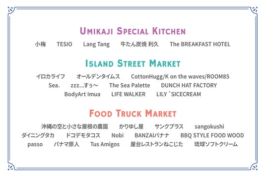 さらに、無料エリアにはアパレル雑貨の買い物が楽しめるマーケットや、こだわりのテント出店、キッチンカーによるフードが並びます。加えて、POSILLIPO(ポジリポ)ではオリオンルーフトップバーを展開し、ここでしか味わえない限定のメニューをお楽しみいただけます。瀬長島ホテル内「龍神の湯」では、特別イベント参加による入浴料金割引をご用意するなど、多彩なコンテンツを通じて一日中楽しめるフェス体験をお届けします。