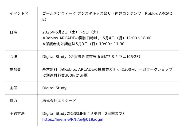 さらに、本パッケージを活用した第2回目となるイベントが、2026年5月4日(月)より佐賀市のデジタル教室「Digital Study」が主催する「ゴールデンウィーク デジスタキッズ祭り」内にて開催されることをお知らせいたします。