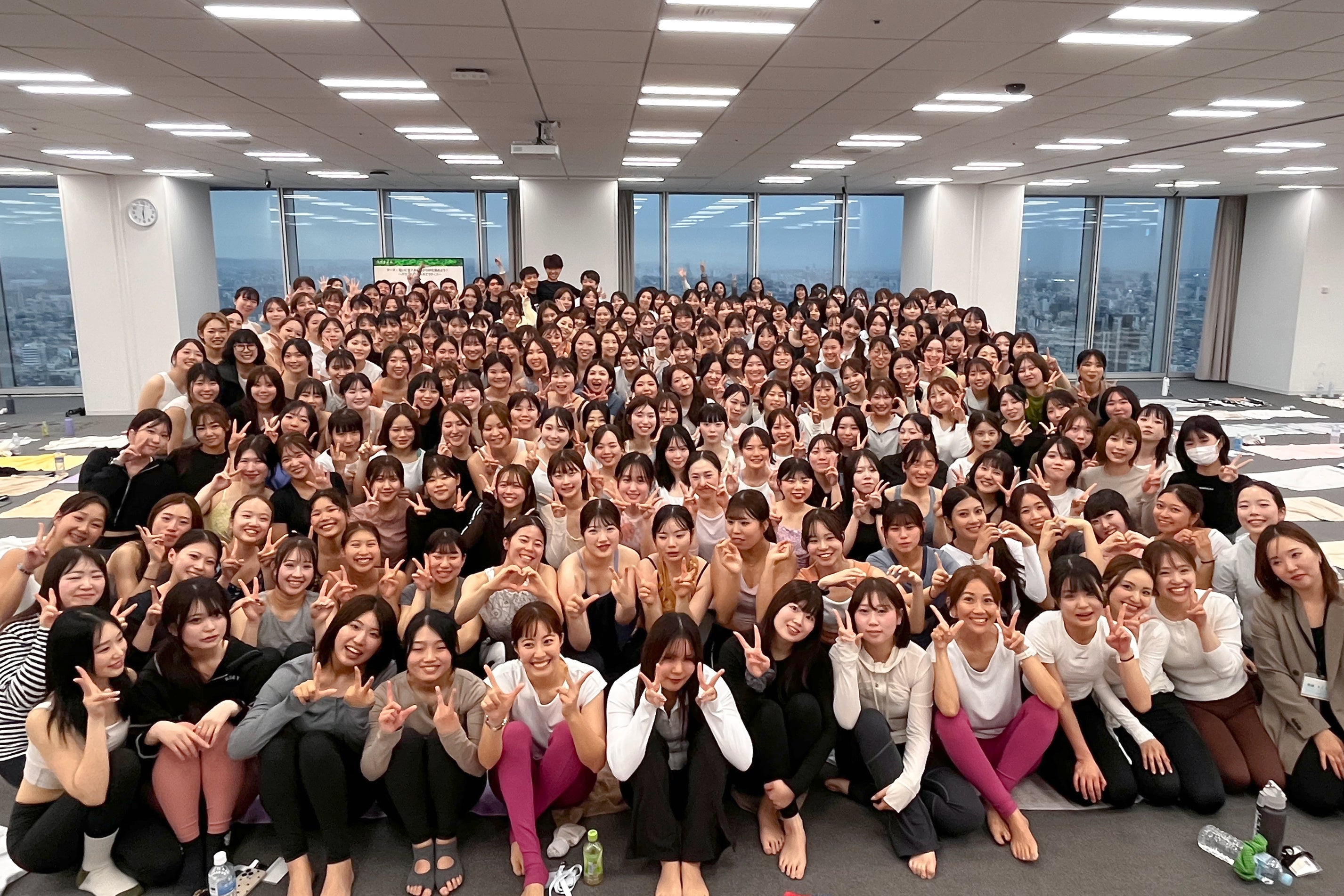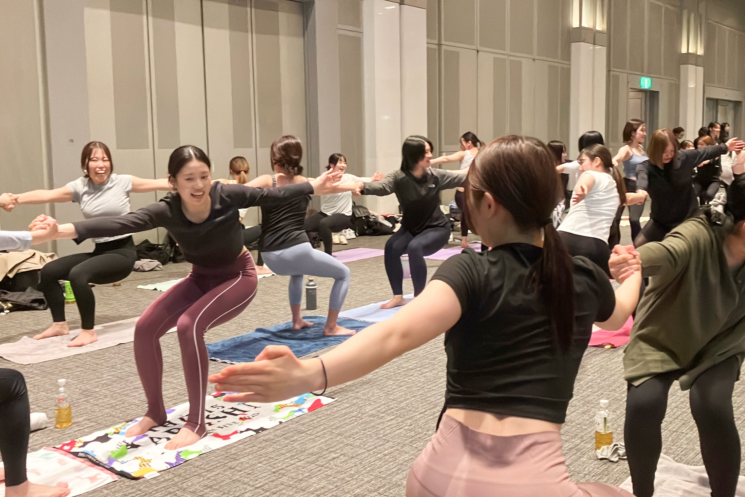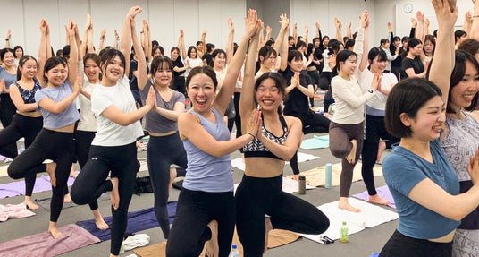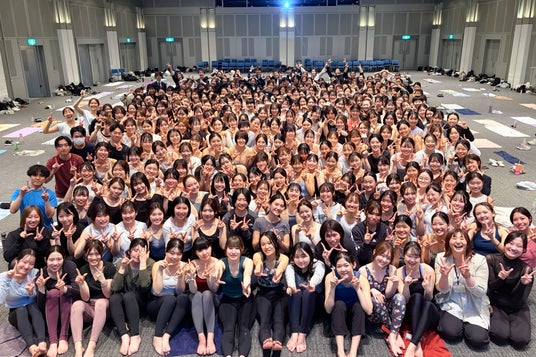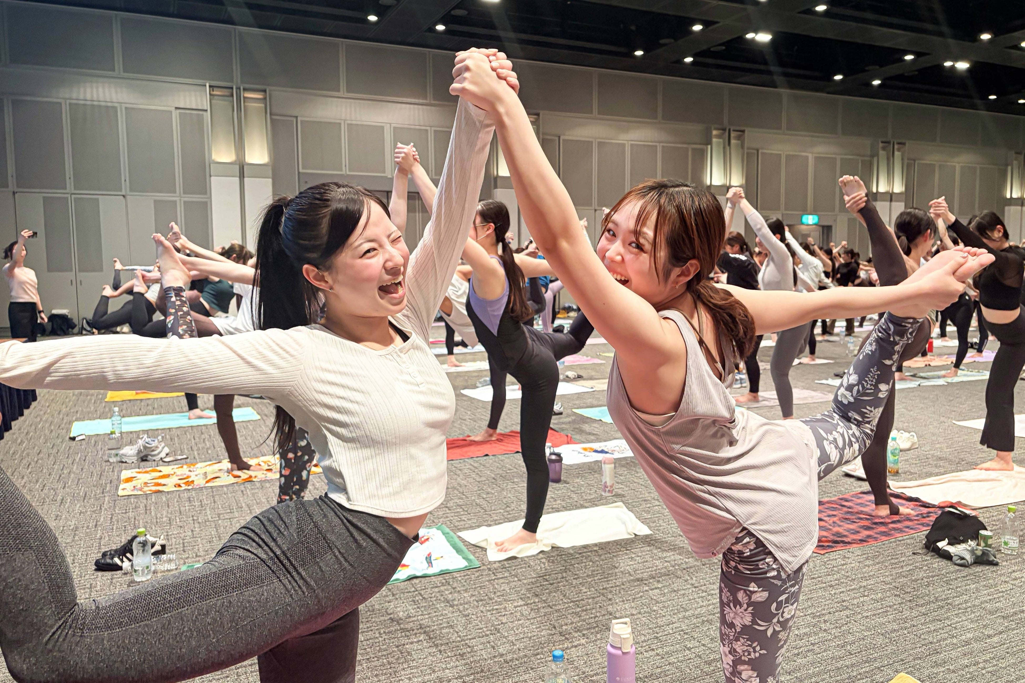 また、2日目には本入社式の象徴的なプログラムとして、ホットヨガスタジオLAVAおよびマシンピラティスRintosullの2ブランドの新入社員全員によるヨガ体験を実施。東京・大阪両会場で計437名が一斉にポーズをとると、会場には圧倒的な一体感が広がりました。