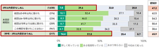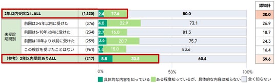 今回の調査では、子宮頸がん検診の未受診期間が長い層ほど、検診や疾患に関する知識・情報認知が低い傾向にあることも明らかになりました。例えば、子宮頸がんは「自覚症状がないまま進行すること」(図表 6)や「早期発見・早期治療で治ること」(図表 8)といった疾患リスクに関する知識が、直近2年以内に受診した層に比べて、未受診層の平均は20ポイント以上低いことがわかります。未受診期間が長い層に対しては、子宮頸がん検診の具体的な価値と、その重要性を浸透させていく必要があります。