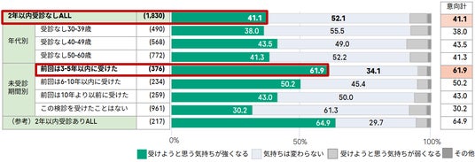 HPV検査は、従来の細胞診よりも高い精度でリスクを判定できるのが特徴で、検査結果が精密検査不要(HPV検査陰性)であれば、次回の受診期間を「2年に1回」から「5年に1回」に延ばすことができます。本調査において、この「5年に1回のHPV検査」の説明後、直近2年間未受診のうち41.1%が「受けようと思う気持ちが強くなる」と回答しました。さらに「忙しい」を比較的に高い割合で理由に挙げ、受診から近年遠ざかっている層(前回は3~5年以内に受診)では、61.9%が受診に前向きな意向を示しています(図表4)。従来の「2年に1回」の子宮頸がん検診に加え、「5年に1回」という新たな選択肢が増えることは、検診の受診率向上に寄与する可能性を示しています。