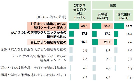 直近2年以内に受診した層に、子宮頸がん検診を受診したきっかけを聞いたところ、主な要因は、「市町村からのクーポン・案内状」であることが明らかになりました(図表 9)。受診層の40.5%が受診のきっかけとして挙げており、これは「かかりつけ医からの勧め」(17.9%)や「職場からの勧め」(16.1%)を大きく上回っています。また、有職者に限定した場合でも「市町村からのクーポン・案内状」(36.8%)が最多となり、「職場からの勧め」(21.1%)よりも高い割合でした。これらの結果は、受診の準備や費用負担に関する障壁を取り除く具体的な情報提供が、受診の意思決定を後押ししていると考えられます。