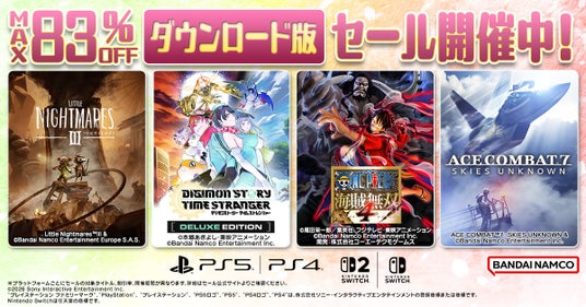 株式会社バンダイナムコエンターテインメントは、ダウンロード版ゲームをお得に購入可能なセールの開催をお知らせいたします。『リトルナイトメア3』や『デジモンストーリー タイムストレンジャー デラックスエディション』など、人気タイトルが最大83%OFFの特別価格でお楽しみいただける期間限定のセールです。