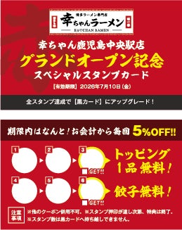 「幸ちゃんラーメン 鹿児島中央駅店」のオープンを記念し、先着3,000名様限定で、使えば使うほどお得になる「グランドオープン記念スペシャルスタンプ(赤)カード」を配布いたします。本カードは、ラーメン1杯(学割ラーメン含む)のご注文につきスタンプを1個付与。スタンプが貯まるごとにトッピングやサイドメニューが無料になるだけでなく、条件を達成すると「さらにお得な「黒カード」へランクアップできる特別なプログラムです。初めてご来店いただくお客様はもちろん、何度も通っていただくことでより「幸ちゃんラーメン」をお楽しみいただける企画です。