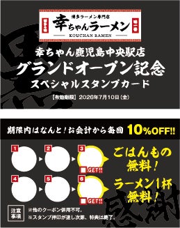 世界10カ国90店舗以上を展開するラーメンブランド「博多一幸舎」や「幸ちゃんラーメン」を運営する株式会社ウインズジャパンホールディングス(所在地:福岡県福岡市博多区、代表取締役社長:吉村 幸助、以下「当社」)は、2026年4月10日(金)11:00に、博多ラーメン専門店「幸ちゃんラーメン 鹿児島中央駅店」をアミュプラザ鹿児島 AMU WE 1階にグランドオープンいたします。オープンを記念し、先着3,000名様限定で「グランドオープン記念スペシャルスタンプカード」を配布いたします。