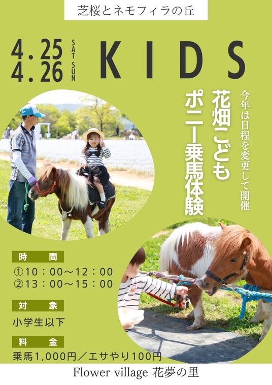花畑ポニーこども乗馬体験花畑でポニーとふれあう体験です。今年は開催日程を早めました。ひとあし早くこどもの日としてお過ごしください。