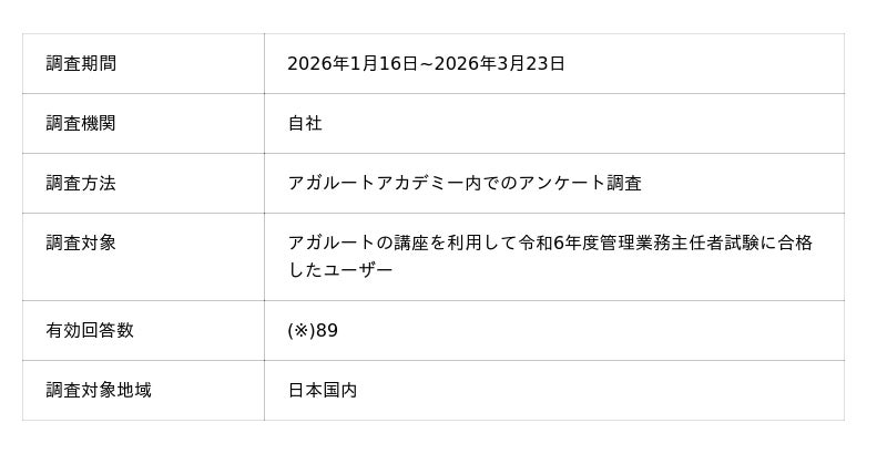 株式会社アガルート(本社:東京都新宿区、代表取締役:岩崎 北斗、以下「アガルート」)が運営する「アガルートアカデミー」は、アガルートの講座を利用して管理業務主任者試験に合格したユーザーに対してアンケートを実施いたしました。