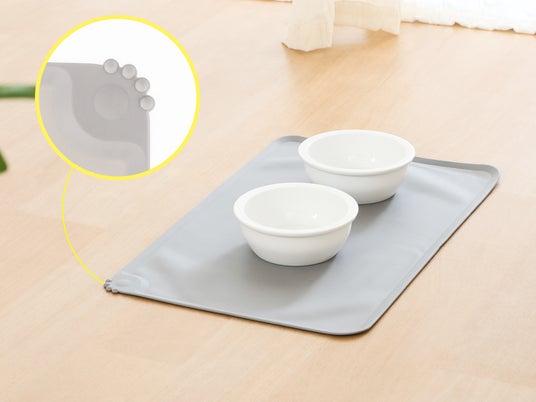 ペットの食器の下に敷くだけで、食べこぼしや水滴から床をしっかり守る防水マットです。フチに高さを設けた設計で、こぼれた水やフードを受け止め、食事スペースを清潔に保ちます。柔らかく丈夫なシリコン素材を採用しており、滑りにくくズレにくいのも特徴。汚れた場合はサッと拭き取るだけでなく、丸洗いも可能でお手入れも簡単です。やわらかな素材のため、使わないときは丸めて収納でき、外出先や旅行時にも便利に持ち運べます。シンプルなグレーカラーに肉球のワンポイントデザインをあしらい、インテリアにも自然になじむデザインに仕上げました。