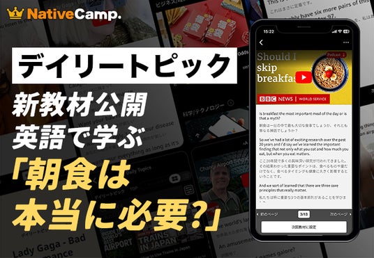 レッスン回数無制限のオンライン英会話サービス「ネイティブキャンプ英会話」を展開する株式会社ネイティブキャンプ(東京都渋谷区 代表取締役:谷川国洋)は、人気教材「デイリートピック」に、朝食と食事のタイミングをテーマにした新教材 “Is breakfast really the most important meal of the day?” を追加したことをお知らせいたします。