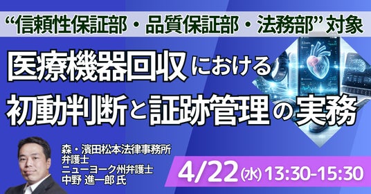 医療機器メーカーにおける回収、当局対応、訴訟といった有事は突発的に発生する一方で、その成否は平時の判断や体制設計によって大きく左右されます。本セミナーでは、医療機器の製造物責任訴訟および無通告立入検査対応を実際に経験した弁護士が、実例を基に、初動対応や当局向け文書が後からどのように評価されるか、また海外本社といかに円滑に連携するかを解説します。