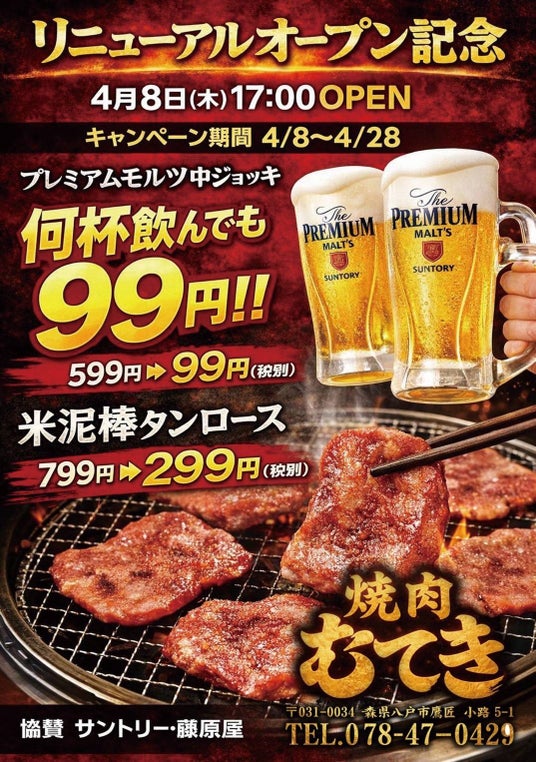 株式会社無敵カンパニー(代表取締役:豊田貴光)が運営する「焼肉むてき」は、ダクト火災の発生により長らく休業しておりましたが、設備の改修および安全対策の強化を完了し、2026年4月8日(水)17:00にリニューアルオープンいたします。