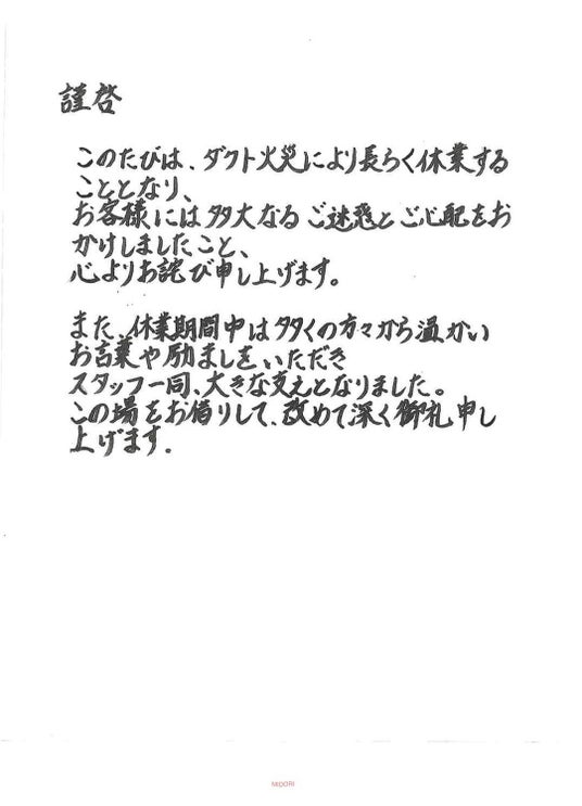 休業期間中は、地域のお客様をはじめ関係者の皆さまに多大なるご迷惑とご心配をおかけしましたことを、心よりお詫び申し上げます。再開にあたり、これまで以上に安心してお食事を楽しんでいただける環境づくりに努めてまいります。