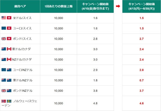 キャンペーン対象通貨ペアと縮小スプレッド (1/3)