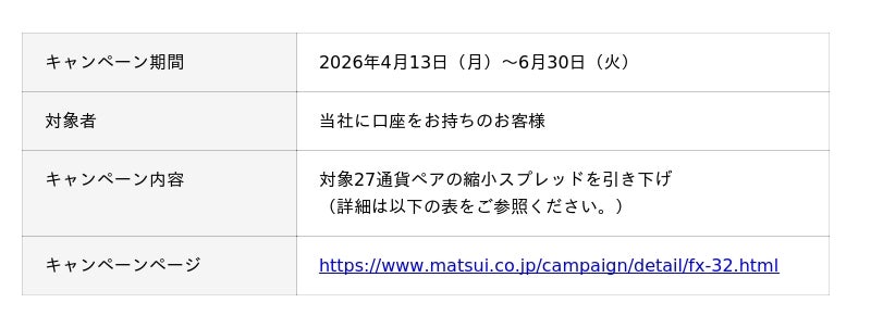 松井証券株式会社(本社:東京都千代田区、代表取締役 社長執行役員:和里田 聰、以下「当社」)は、2026年4月13日(月)取引分より、外国為替証拠金取引(FX)において、27通貨ペアの縮小スプレッドを業界最狭水準(※1)に引き下げるキャンペーンを開催いたします。