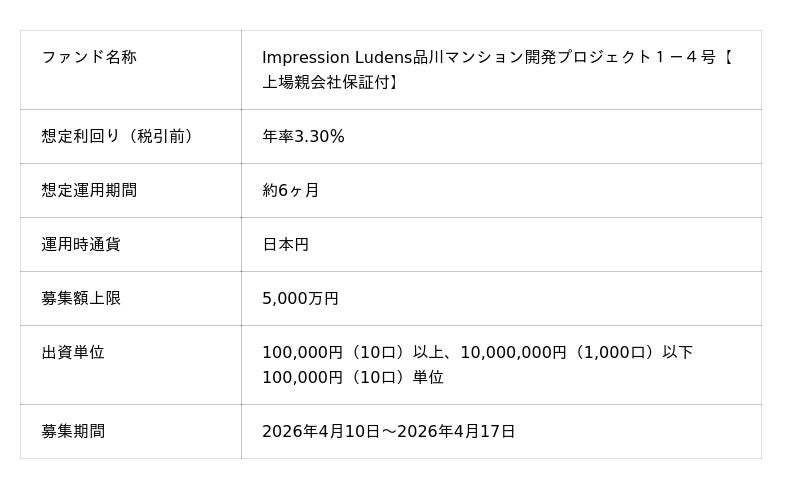 「未来をわかちあう投資」を提供する「Funvest(ファンベスト)」(以下、Funvest)は、「Impression Ludens品川マンション開発プロジェクト1-4号【上場親会社保証付】」(以下、本ファンド)の募集を4/10より開始しますので、お知らせいたします。