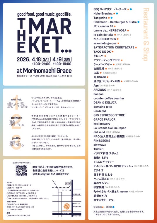 フード(県内):★JP’s vender 61、★sakamoto grapes、★SATISFACTION CURRY&CAFE、★TACO DE OK、★きむらや、★吉田牧場(4/18のみ)、★ラーメン・ブギー(4/19のみ)、★兎 USAGI、Agni(4/19のみ)、PINE&SONS、TRONC、イタリア料理 ラボッカ、どまそば、日本料理 はむら、鉄板かや乃、 DEAN & DELUCA 岡山、 GRACE PARLOR、森のマルシェ、松家製麺(4/18のみ)