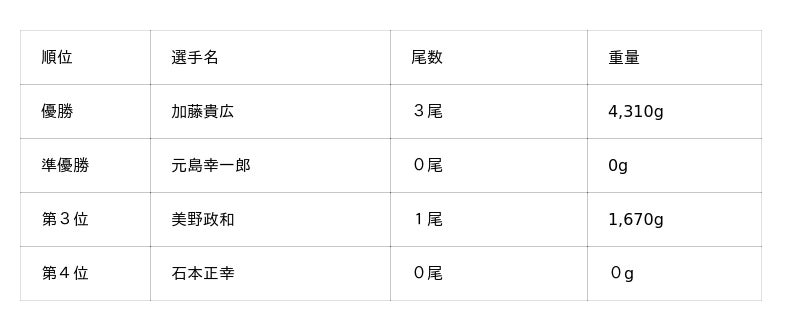 準々決勝は釣り場の地形、ウネリによるサラシや魚の状態を見極めてどのように対応するのか、好機を逃さず1尾をいかに引き出すかが鍵となった。僅差の接戦となる中、加藤選手、石本選手、美野選手、元島選手の4名が準決勝へと勝ち進んだ。
