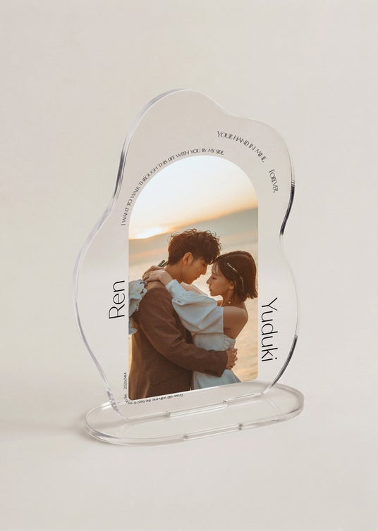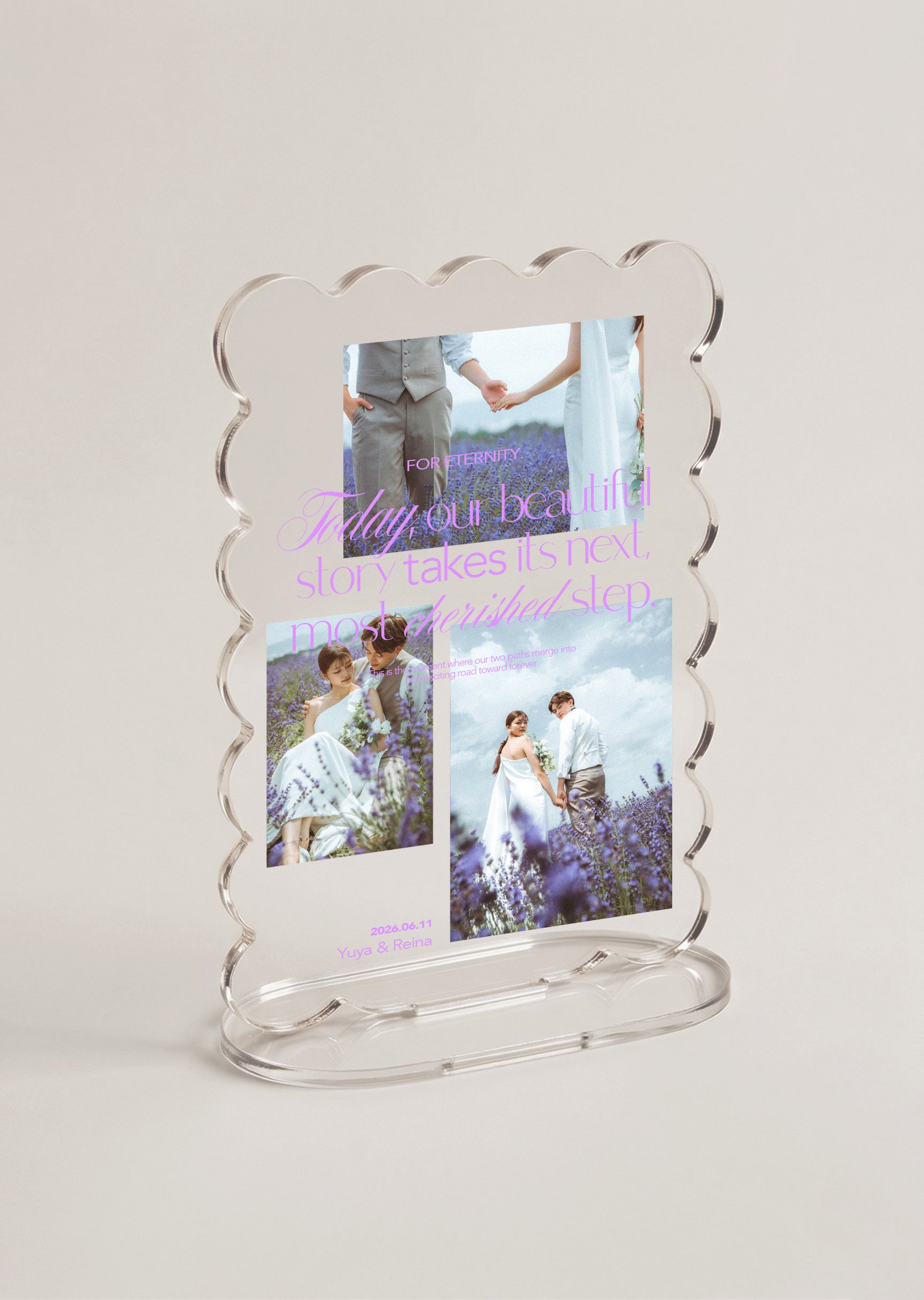 お写真の色味や雰囲気に合わせて、専属デザイナーが文字や背景カラーをパーソナライズ調整。お客様に一番似合う世界にひとつだけのカラーリングでお届けします。