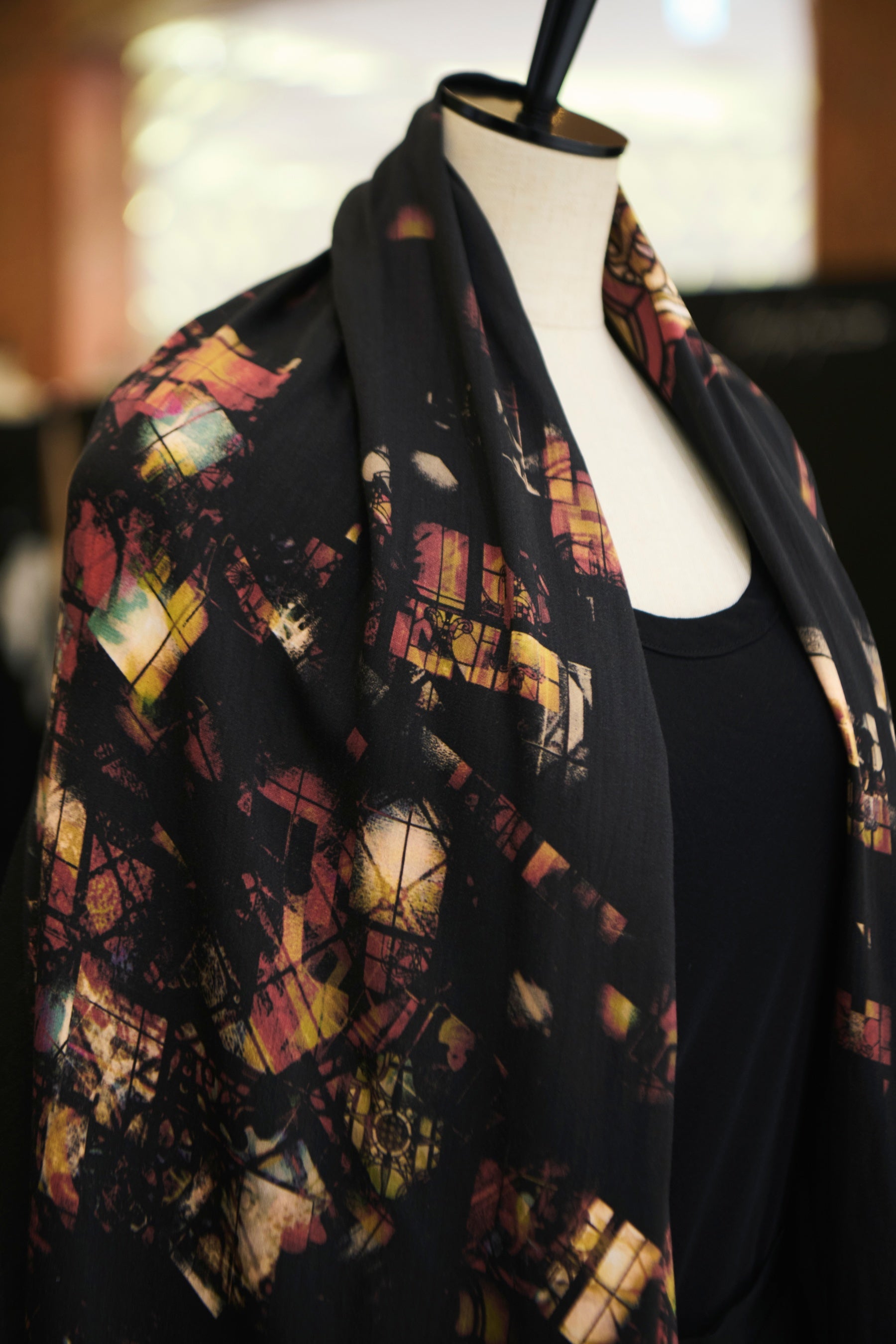アール・デコ様式のステンドグラスや幾何学模様から着想を得たプリントシャツ。花が開く瞬間を思わせる柄と、美しいドレープが調和し、動くたびに華やかな表情を生み出します。