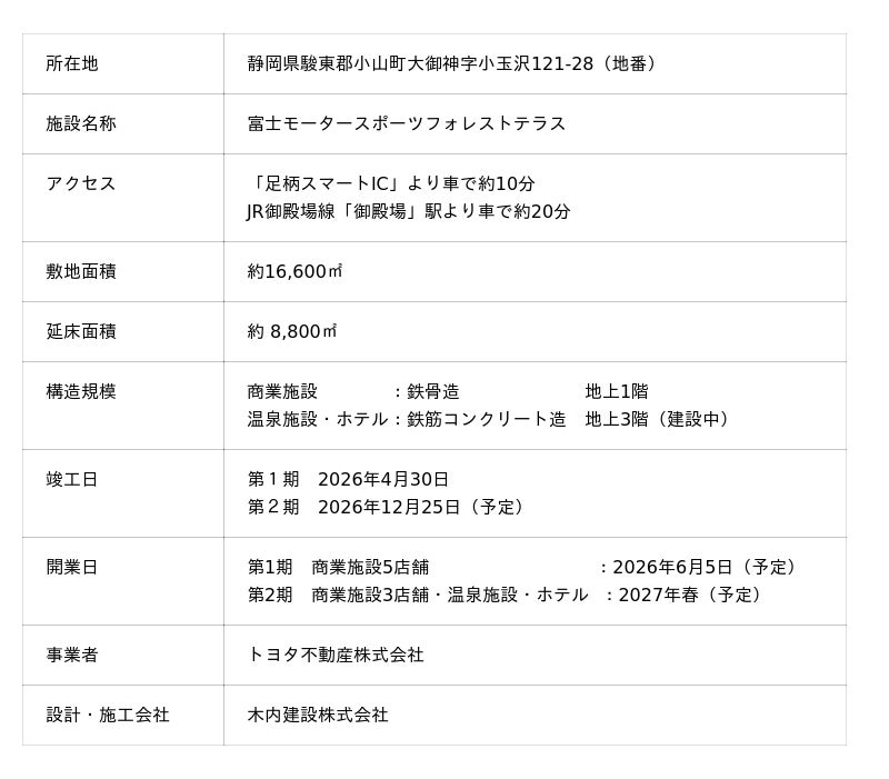 本施設は、2社が静岡県駿東郡小山町で協働して推進する再開発計画「富士モータースポーツフォレストプロジェクト」の一環として、トヨタ不動産が開発・運営します。「富士モータースポーツフォレスト」は、国際サーキット「富士スピードウェイ」を中心とした、モータースポーツや様々なモビリティ体験を楽しめる複合施設で、エリア全体が「新しい体験」や「発見」のある場所へと常に進化を続けています。