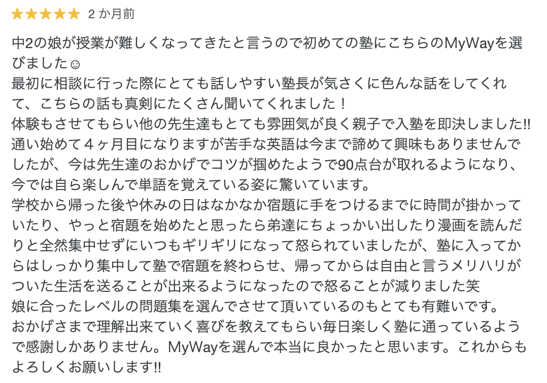 個別指導塾で5科目を学ぶことは、費用や時間の面で大きな負担となることが多いですが、MyWayでは生徒の生活リズムに合わせた通塾形態と家計に優しい料金体系を採用。