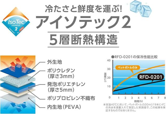 ソフトクーラーに求めたいのは、やはり保冷力。このモデルはアイソテック2の5層断熱構造を採用し、食材や飲み物をしっかり冷たい状態でキープできます。