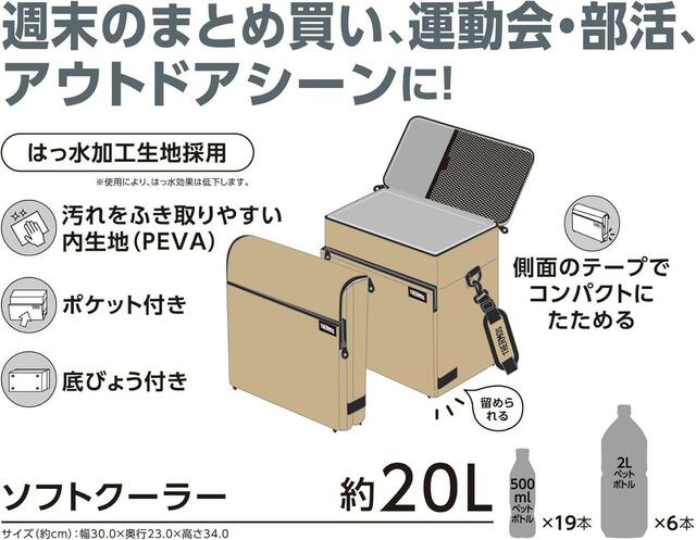 容量は20Lとたっぷりサイズで、まとめ買いした食品や飲み物も余裕で収納可能。ピクニックやアウトドアはもちろん、日々の買い出しでも頼れるソフトクーラーです。