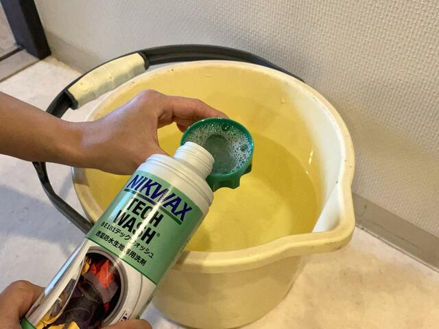 バケツに規定量の水と洗剤を入れ、ウェアをもみ洗いします。