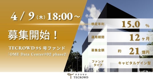 2026年4月9日(木)18時より95号ファンド「OME Data Center#02 phase2」の募集を開始いたします。