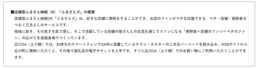 電子チケットは、広川SA(上り線)のショッピングコーナーでご利用でき、広川町のいちごやお茶等の地場産品と、明太子やもつ鍋等の福岡県共通返礼品にご利用いただけます。
