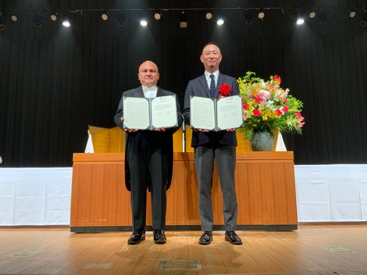 写真:友好曲制定式の様子(作詞:後藤慈明 氏 左 作曲:秋雲燁 氏 右)2024年5月