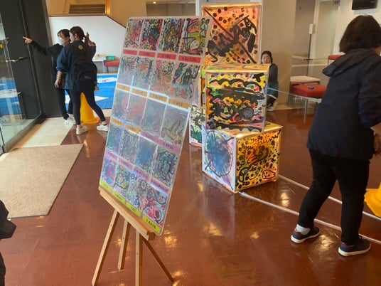 写真:習字とオイルパステルが融合した年長児によるアート作品