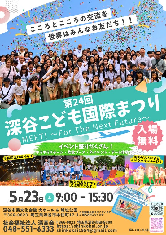 社会福祉法人深高会が主催する今年で24回目を迎える恒例イベント『第24回深谷こども国際まつり MEET! ~For the Next Future~』が、2026年5月23日土曜日に深谷市民文化会館大ホールおよび深谷城址公園で開催されます。このイベントは、先代の故後藤高明統括園長が高校時代の留学経験に基づき、「言葉が通じなくても気持ちは通じ合える」という理念のもと、世界各国から子どもたちを招いて始まりました。現在は、亡き父の跡を継ぎ、自らも留学経験を持つ後藤慈明統括副園長が中心となって実施しています。(写真は過去の様子)