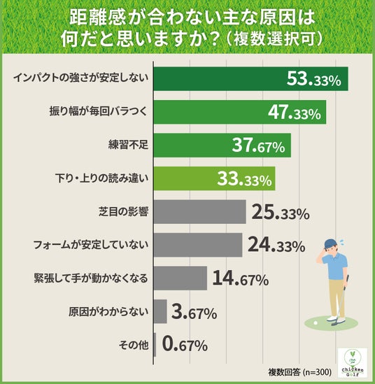 距離感が合わない主な原因について複数回答で調査したところ、「インパクトの強さが安定しない」が53.3%で最多となりました。