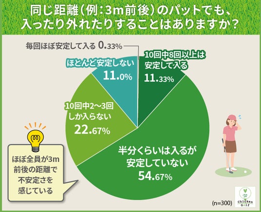 同じ距離(例:3m前後)のパットでも安定して入るかどうかを調査したところ、約9割のゴルファーがパットの安定性に課題を感じていることが分かりました。