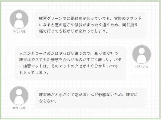 パター練習マットや練習グリーンでは一定の距離感を掴めても、実際のコースとは条件が大きく異なるため、練習の効果を実感しにくいと感じているゴルファーが多いことが分かります。
