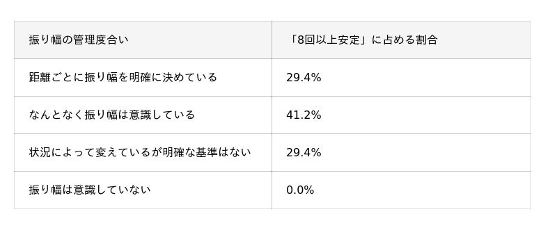 さらに、8割超が「振り幅を管理できれば安定する」と感じているにもかかわらず、定期的に振り幅練習を行っている人はわずか約6%にとどまるなど、理想と実践の間に大きなギャップがあることも明らかになっています。