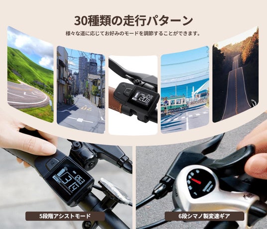 「電動アシスト5段階」×「SHIMANO製6段変速」の組み合わせにより、最大30通りの走行モードを選択可能。勾配や交通状況に合わせ、常に最適なペダリングを提供します。
