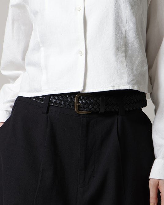 バングラデシュの自社工場にて、職人が一本ずつ手編みで仕立てたレザーベルト。 最大の特徴は、約3メートルに及ぶ4本のレザー紐を、一度も裁断せずにバックルまで一気に編み上げる手仕事です。